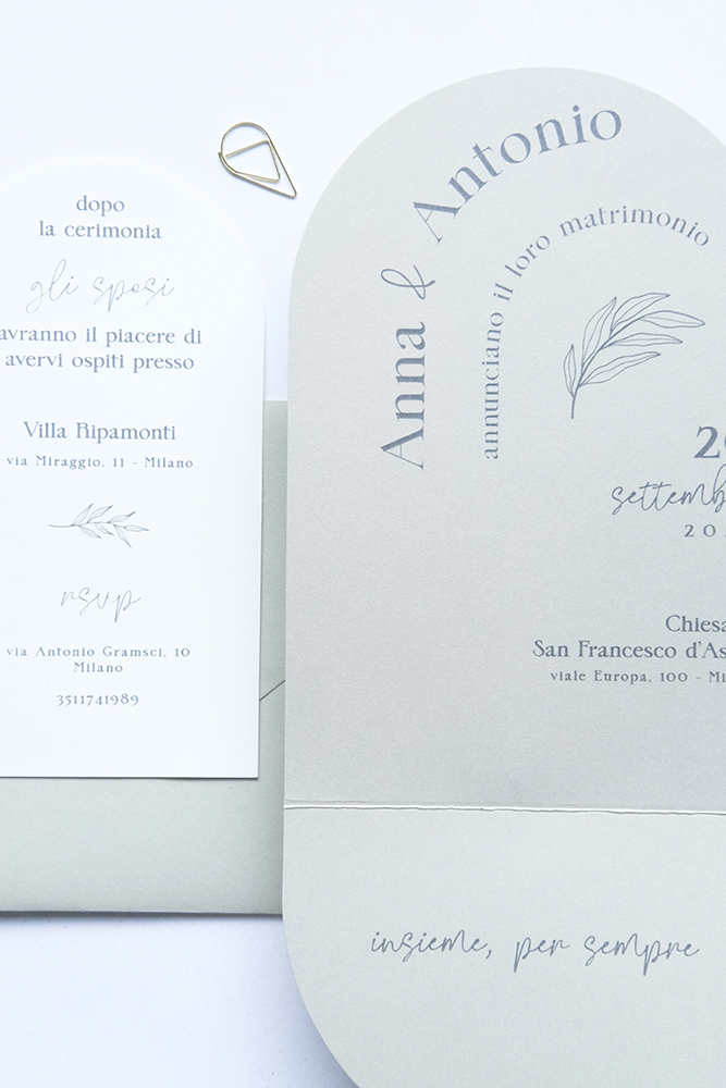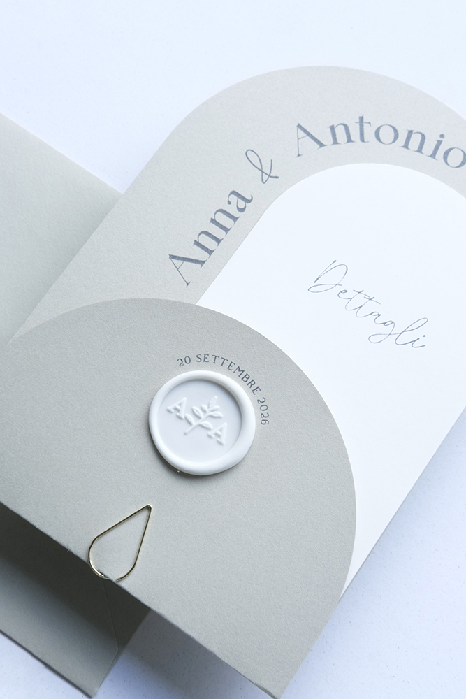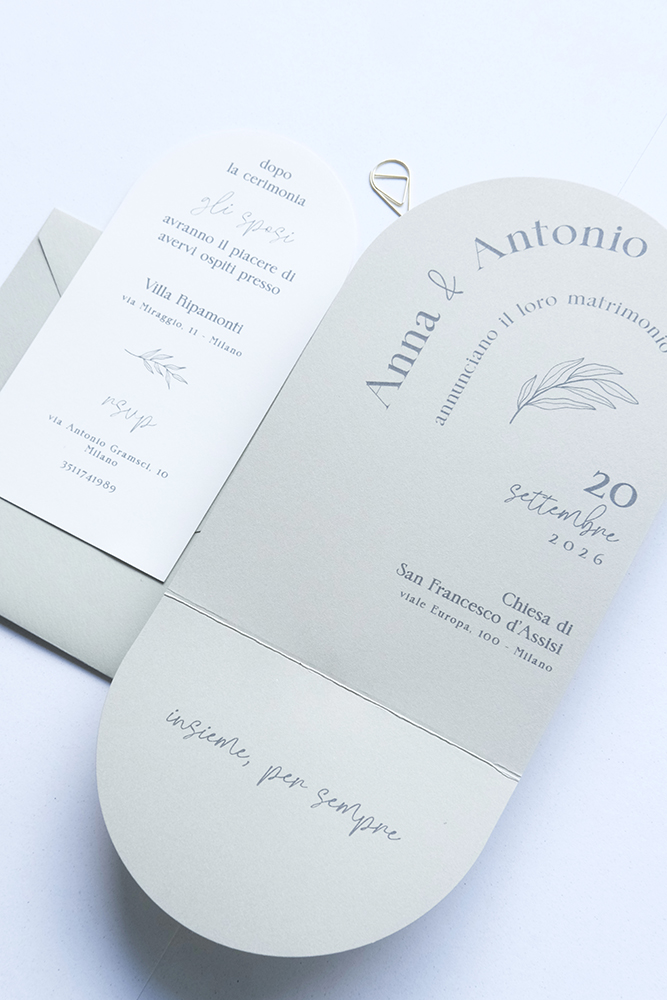 RICHIEDI CAMPIONE SU WHATSAPP Quantità*: PREZZO DI PARTENZA ESTERNO INVITO: da 30 a 49 pz: 3,20 € cad. da 50 a 99 pz: 2,80 €cad. da 100 a 199 pz: 2,40 € cad. da 200 a 299 pz: 2,00 € cad. oltre i 300 pz: 1,70 € cad. Esterno e interno Primo Cartoncino: Eco - Salvia chiaro Secondo Cartoncino: Perlati - ivory Naturali - beige chiaro Perlati - champagne Perlati - rosa chiaro Eco - Salvia chiaro Eco - Eucalipto Eco - Carta da zucchero Accessori Busta: No Si (+0.60 €) ╰ colore: 01 Bianco Perlato02 Ivory08 Rosa chiaro09 Biondo scuro18 Blu scuro24 Borgogna36 Bianco Naturale37 Beige chiaro naturale39 Kraft chiaro40 Kraft scuroCarta traslucida ╰ fodera (+0.65 €): No 08 Rosa chiaro 09 Biondo scuro 18 Blu scuro non perlato 39 Kraft chiaro 66 Argento gioiello 67 Champagne gioiello 69 Oro rosa gioiello Stampata (specificare in 'Note') Ceralacca: No Dalla collezione (cod. in note) (+0.80 €) Con petali di fiori a scelta (+1 €) Con foglia oro/ororosa/argento (+1.10 €) Timbro Personalizzato (Prezzo su richiesta) Tag o Adesivi: No Tag in cartoncino(+0.40 €) Tag adesivi (+0.45 €) Gioielli e Fibbie: No G1 (+1.30 €) G2 (+0.70 €) G3 (+1.1 €) G4 (+0.70 €) G5 (+1.1 €) G6 (+1.1 €) G7 (+1 €) G8 (+0.50 €) G9 (+1.10 €) G10 (+0.40 €) F1 (+1.10 €) F2 (+1.10 €) F3 (+0.70 €) F4 (+0.70 €) F5 (+1.00 €) F6 (+1.00 €) F7 (+0.70 €) F8 (+0.80 €) Chiavi: No C1 (+0.75 €) C2 (+0.75 €) C3 (+0.65 €) C4 (+0.65 €) C5 (+0.65 €) C6 (+0.55 €) C7 (+0.55 €) C8 (+0.55 €) C9 (+0.35 €) C10 (+0.35 €) C11 (+0.35 €) C12 (+0.65 €) C13 (+0.65 €) Fascette: No FAS10 (+0.80 €) FAS11 (+0.75 €) FAS12 (+0.70 €) FAS13 (+0.65 €) FAS14 (+0.75 €) FAS15 (+0.80 €) Nastro: No Seta (bobina 5mt: 12.00 €) Raso 2cm (bobina 22mt: 12 €) Raso 1cm (bobina 22mt: 10 €) Cordini cerati (bobina 50mt: 15.00 €) Corda Naturale (bobina 50mt: 11.80 €) ╰ quantita' nastro: *Specificare il colore nelle Note Richieste speciali Totale 0.00 € FISSA UN APPUNTAMENTO TELEFONICO Verrai riconattato telefonicamente per definire ogni dettaglio NON STAI ANCORA ACQUISTANDO: data la vasta gamma di personalizzazione, vogliamo essere certi che l'ordine dei vostri inviti sia configurato correttamente. L'ordine verrà elaborato il più presto possibile e verrai ricontattato per la verifica dei dettagli del vosto invito, la conferma d'acquisto e le modalità di pagamento.CAMPIONI:campioni non personalizzati, ordinabili nella sezione campioni tramite whatsappCOLORI:i colori potrebbero risultare diversi da quelli visti in fotografia per via della differenza di dispositivo dal quale si guardano ELABORAZIONE GRAFICA: gratuita utilizzando la nostra app online di modifica scegliendo il template. Da valutare in caso di richieste speciali.CODICE SCONTO: eventuali codici sconto verranno verificati e applicati successivamente all'ordine ricevuto. TEMPI DI PRODUZIONE: ordine senza stampa non personalizzato (colori disponibili): 3-5 gg lavorativi dopo la conferma; ordine con stampa personalizzato (colori disponibili): 4-6 gg lavorativi dopo la conferma della grafica; ordini colori non disponibili: 20 - 30 gg lavorativi. Durante alta stagione i tempi di produzione potrebbero subire variazioni previa nostra comunicazione. COSTI DI SPEDIZIONE: per gli inviti gratuita oltre i 50 pezzi.