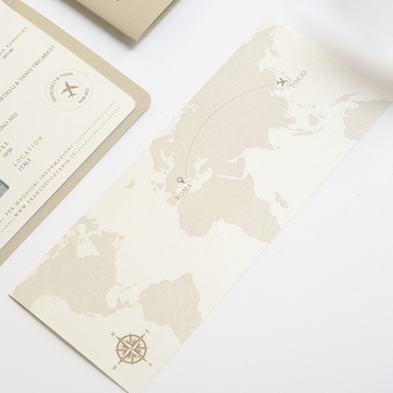 Descrizione: partecipazione di matrimonio tema viaggio in stile passaporto