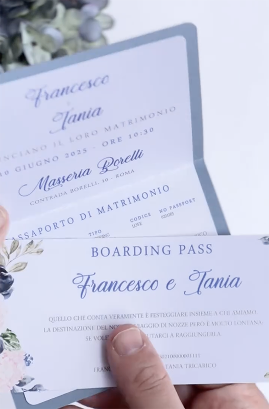 Descrizione: partecipazione di matrimonio tema viaggio in stile passaporto
