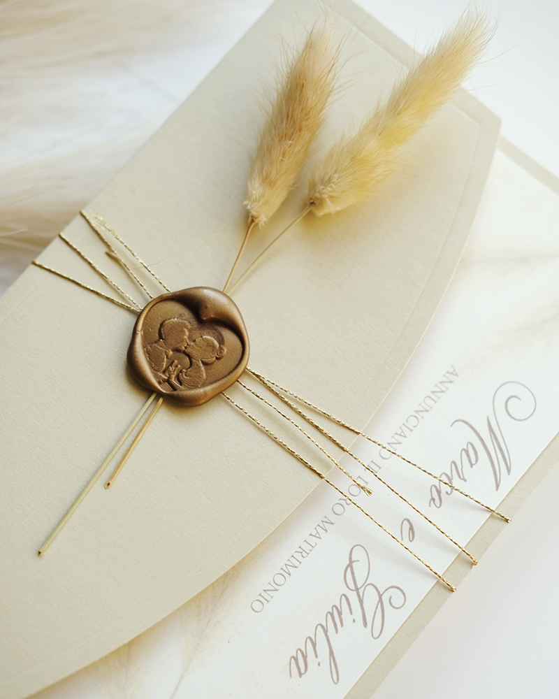 Disponibili in diverse varianti cromatiche si adattano a ogni tema nuziale e possono essere completati con sigilli in ceralacca, nastri e buste coordinate.
