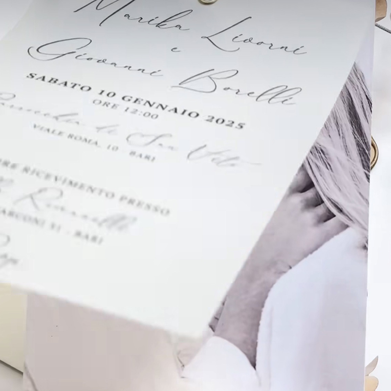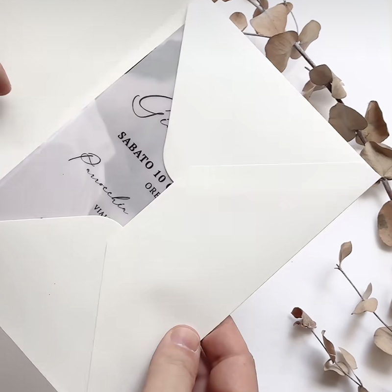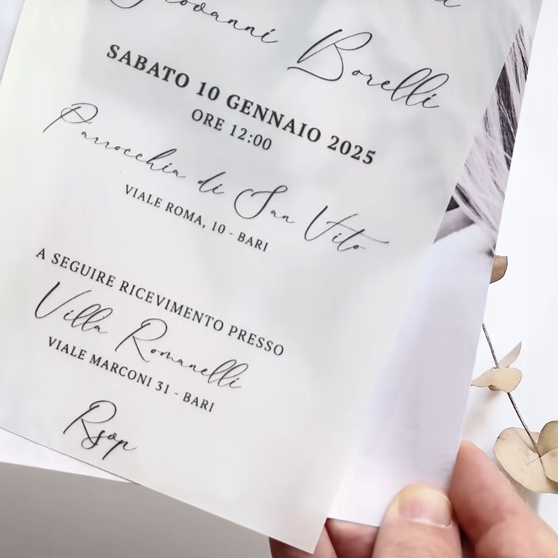 Descrizione: Gli inviti il carta traslucida vengono realizzati inclusi di stampa (grafica a scelta da template).