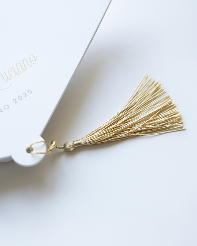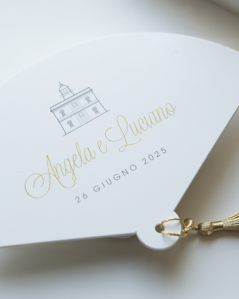 Perfetto per cerimonie estive o all’aperto, questo ventaglio non è solo un accessorio utile ma anche un ricordo raffinato per gli ospiti. Può essere abbinato alle partecipazioni, ai libretti messa o al coordinato grafico del matrimonio.